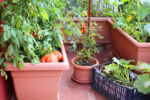 plants of red tomatoes and zucchini in the big pots of an urban garden in the balcony of the house in the city