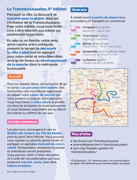 Cette année encore, pour traverser Toulouse et ses environs à pied et converger vers l’arrivée commune (le théâtre de verdure de l’ile du Ramier), l’équipe vous a préparé de nouveaux itinéraires.