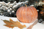Autumn in the snow. A round ripe orange pumpkin lies on a white snow cover. Nearby lie dry yellow maple leaves. In the background a blue spruce